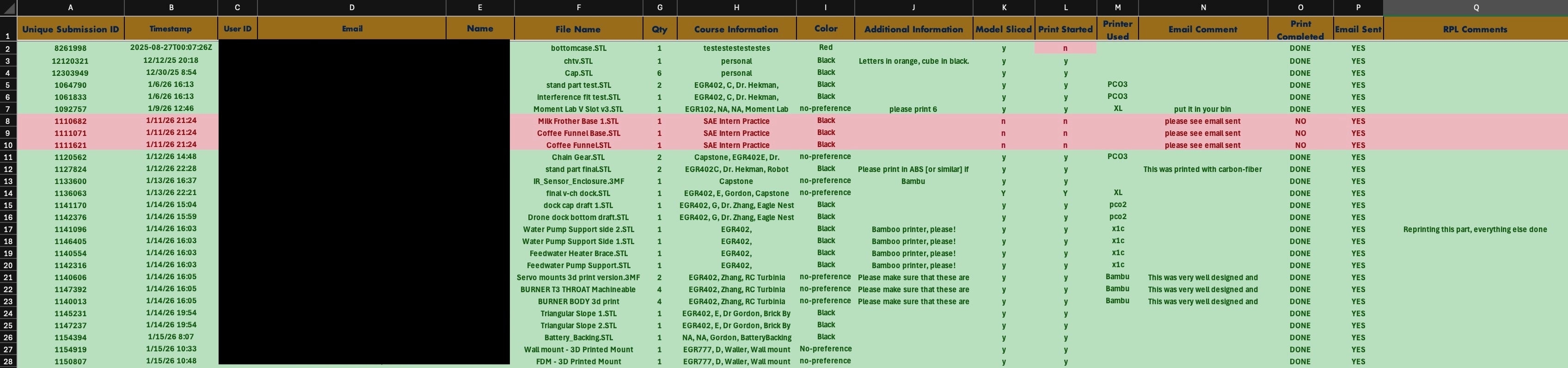 Students could upload incorrect file types, were required to manually name each part, could submit items larger than our build plate, and sometimes entered incorrect email addresses, leaving us no way to contact them. Additionally, multiple parts were treated as a single job, forcing staff to wait until all prints were completed before releasing any of the items.